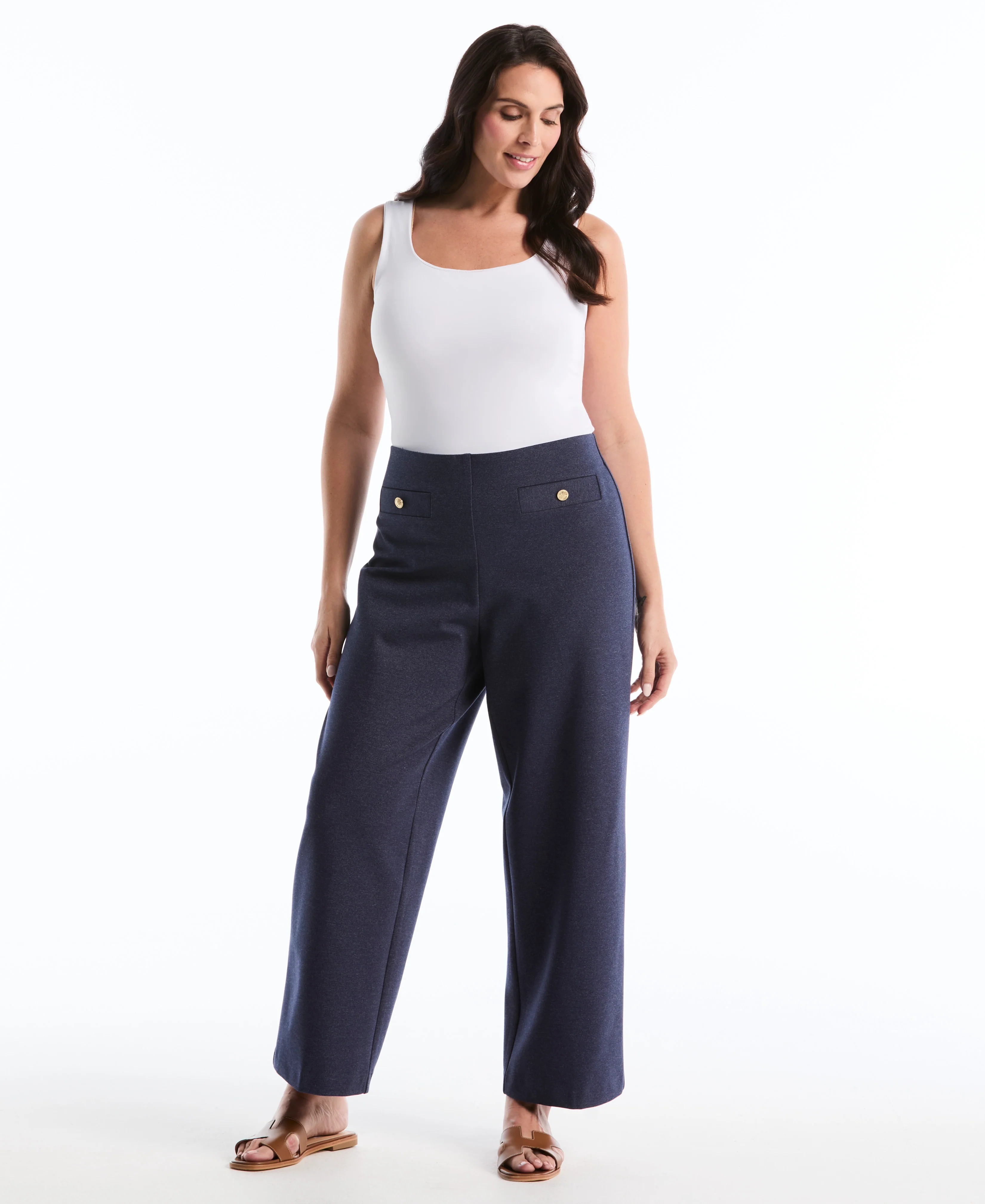 Revamp your casual wardrobe with these sleek wide leg Rafaella pants. Made with a soft stretch woven fabric, the women’s pants combine a flattering, flexible fit with a classic indigo denim-like look. The Hollywood elasticated waistband makes these pants easy to pull on quickly, while darts at the back help them conform to your curves. The wide leg pants are finished with non-functional pockets at the front that are decorated with metal buttons for a timeless, elegant look.